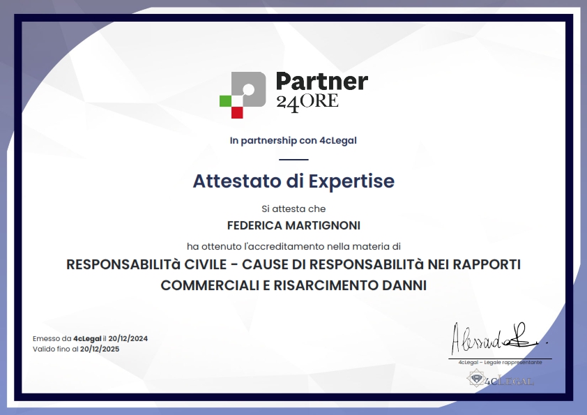 Federica Martignoni si è laureata in Giurisprudenza nel 1989 presso l’Università di Milano. Successivamente ha proseguito il suo tirocinio di formazione in alcuni studi legali di Milano. Successivamente, superò con successo l’Esame Statale per la qualifica per esercitare la professione e si dedicò immediatamente alla professione con passione e dedizione.