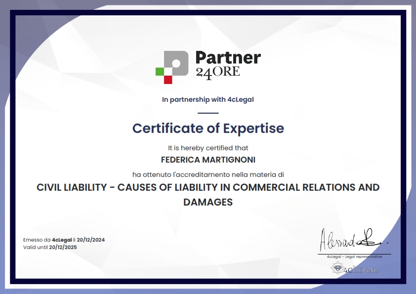 Da dicembre 2024 è entrata a far parte del NETWORK “Partner24ORE” come Professional Partner, ovvero un PROFESSIONAL HUB  creato dal Gruppo “Il Sole24Ore”, che include Esperti e Professionisti con esperienza comprovata e alto profilo, che condividono le loro competenze per renderle disponibili alle Aziende (PMI) con specifiche esigenze.